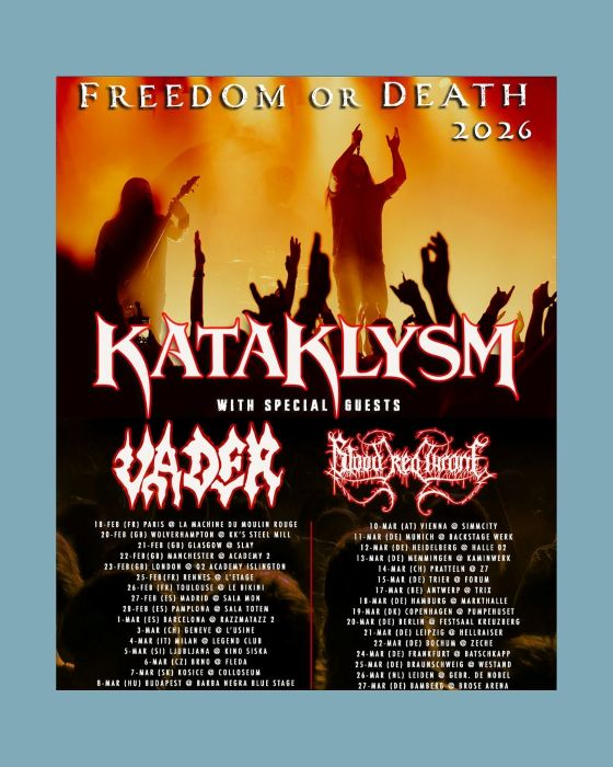 Het is donderdag 26 maart 2026 en het is een koude aangelegenheid, daar het slecht een paar graden boven nul is en het regelmatig druilerig regent of waar de hagel je gezicht geselt. Echt goed winters weer om een avondje black metal te gaan beluisteren, echter vanavond staat er een heet avondje death metal gepland in Nobel te Leiden. Kataklysm trekt door Europa en heeft Vader en Blood Red Throne in zijn kielzog meegezogen. De band doet dat vanavond voor de een-na-laatste keer; dan is het welletjes geweest. De bands staan al meer dan een maand op de planken om het publiek te trakteren op vele blastbeats en energiek gegenereerde brutaliteit. De mannen hebben de tour “Freedom or Death” gedoopt. Waar die naam vandaan komt? Aangezien schrijver JohannesV niet van moeilijke vragen terugschrikt, checkt hij met volle moed in bij Nobel. De mooie plaatjes zijn geschoten door Eus Straver.