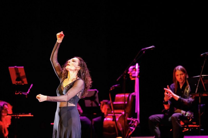 Uróboros kennen we natuurlijk van komische sciencefictionserie Red Dwarf (nou vooruit, en uit de Griekse mythologie) en dus zijn we bekend met het concept van de staarteter: het symbool van de altijd doorgaande cyclus van leven en dood. Ook de afsluitende compositie Uróboros: The Fall of the Gods is weer heel verhalend. Dat vertellende kunnen we zo langzamerhand wel het overkoepelende kenmerk van de zo verschillende werken van Florian noemen. Hier belanden we aan de onderkant van de brug: de onderwereld en de ondergang en dus mag het wat harder en wat ontwrichtender. Úrsula is inmiddels ook volledig in het zwart gekleed. We horen een volle grunt, een gedempte elektrische gitaar en een licht hysterische dwarsfluit hoog over. De agressie wordt benadrukt door felle lichtflitsen en contrabassist (Felix ,als ik het goed heb) die stevig en met een volle lach staat te headbangen. Geen snobisme hier! Er komt zelfs een beetje shredden voorbij, maar in de opbouw blijft het werk toch herkenbaar in flamenco geworteld, benaderd vanuit steeds een andere invalshoek.