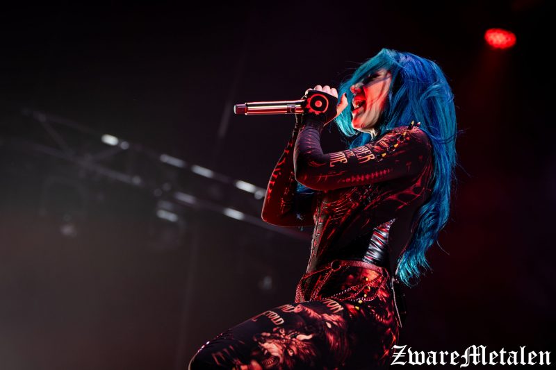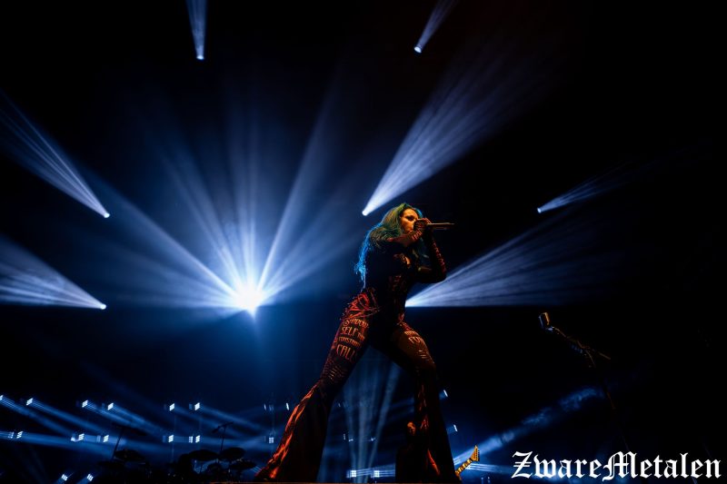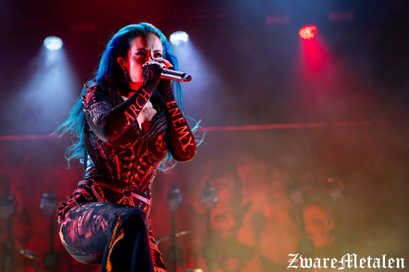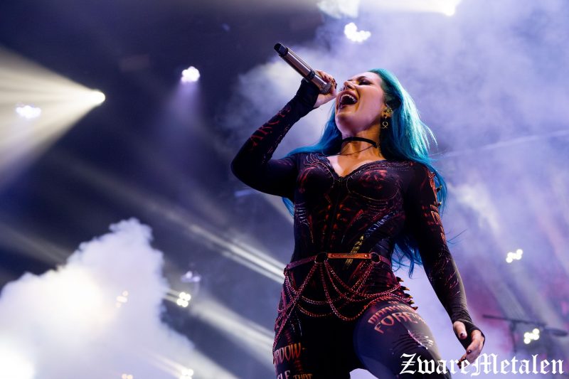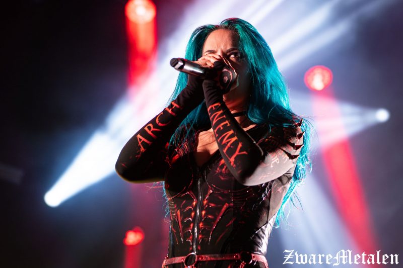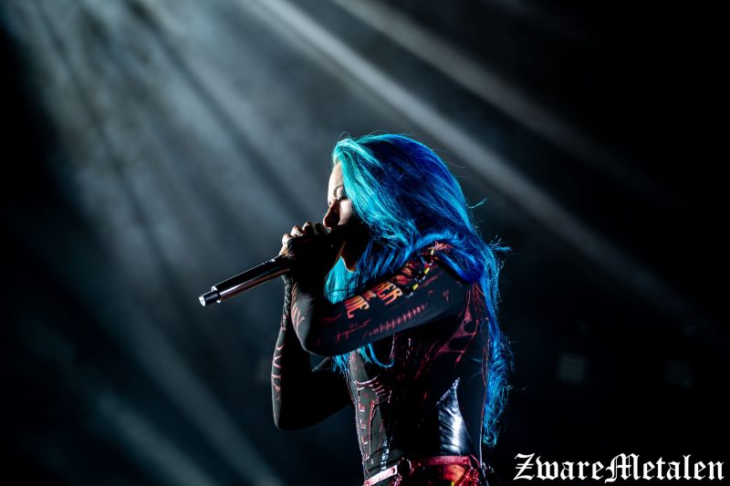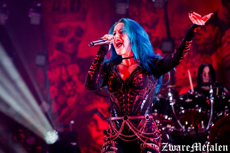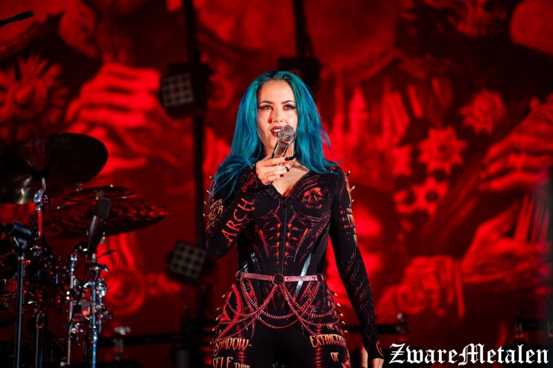 De banner wordt door drummer Daniel Erlandsson gebruikt voor een schaduwspelletje alvorens hij begint met een stevige drumintro inzet en Deceiver, Deceiver de set begint. Hier wordt ook direct mijn probleem met de band duidelijk. Technisch is het goed, drum- en gitaarwerk van de hoogste plank, frontvrouw Alissa White-Gluz heeft een geweldige strot… en toch valt het allemaal net niet samen. Het voelt ergens wat zielloos en het komt daardoor niet binnen zoals de band waarschijnlijk wil. Alle puzzelstukjes zijn er, maar het totaalplaatje klopt niet. Een melodische deathmetalband waar de melodieën ontbreken. Niet dat het altijd misgaat. Dream Stealer is goed gelukt met een leuk refrein en een duidelijke opbouw. Datzelfde geldt voor War Eternal, al hoor ik telkens Dancing With Tears in My Eyes in de brug naar het refrein. Het publiek hoort het allemaal rustig aan tot het oudere nummer My Apocalypse voorbij komt en er een kleine moshpit start.