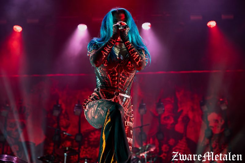 Headliner Arch Enemy heeft in Nederland nog niet eerder een clubshow gegeven van het formaat AFAS Live. Een dinsdagavond is misschien niet ideaal, maar zelfs met drie fantastische supportacts krijgen ze de zaal niet vol. Dat is vrij opmerkelijk, want de band lijkt onverminderd populair, al geef ik ook toe dat ze mij persoonlijk nooit hebben weten te bekoren. De banner met tekst ‘pure fucking metal’ waar we in het interim tegenaan moeten kijken vind ik dan ook een beetje te veel borstklopperij. De old school rock en heavy metal nummers die in de tussentijd gespeeld worden kan ik dan beter waarderen.