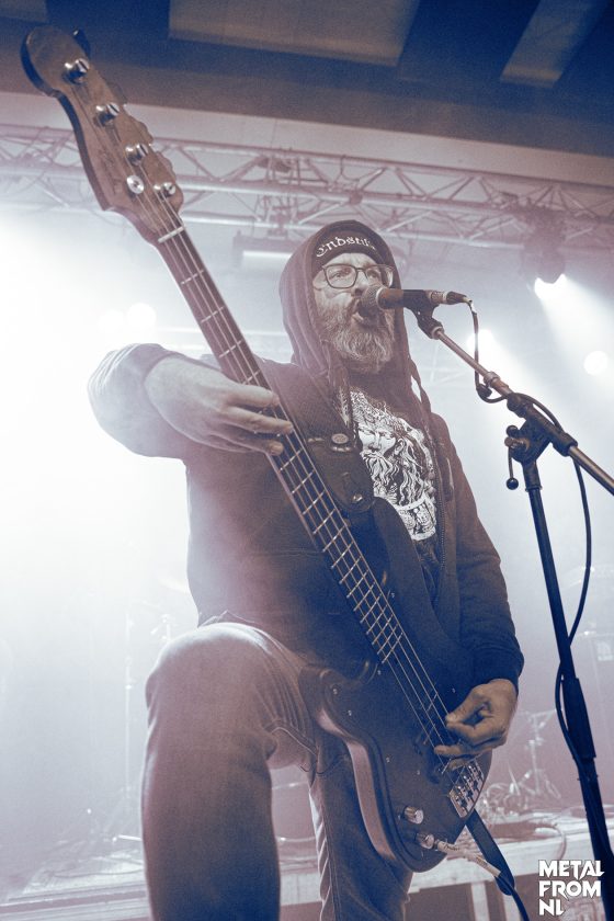 Buiten is het bloedjeheet, binnen verschijnt J, vocalist en bassist van Nether met muts en hoodie achter de microfoon. De band trapt af met het eerste nummer dat ooit van dit fijne gezelschap verscheen: The Hand of the Unspoken: gelijk ook terug te vinden op debuutplaat Between Shades and Shadows. Misschien dat J’s kledij zijn weerslag heeft op zijn stembanden, want de mans grunt klinkt lekker warm, zeker als met For Your Own Glory het gas er flink opgaat. dB’s stroomt aardig vol voor dit beest van een nummer, deze inktzwarte beuker met die lekkere baslijn. Ook het titelnummer van het vorig jaar verschenen The Blood of Rats gaat erin als een schaap bij een hongerige wolf of een witbiertje op een bloedhete middag als vandaag: het zweet staat al in m’n nek door alleen maar naar J te kijken.