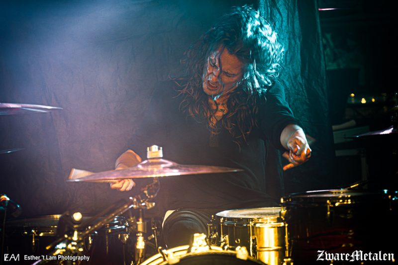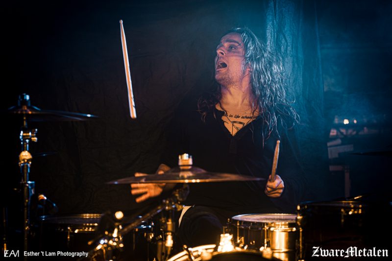 Tijdens de korte pauze wordt de podiumaankleding van Eclipse onthuld. Een drumriser met lichtbalken er omheen, verlichte bliksemschichten, en een tweetal statieven met liggende lichtbalken. Het valt mij op dat ook zij de backdrop hebben opgehangen, een detail dat veel bands in deze zaal overslaan. Het visuele aspect is alvast prima.