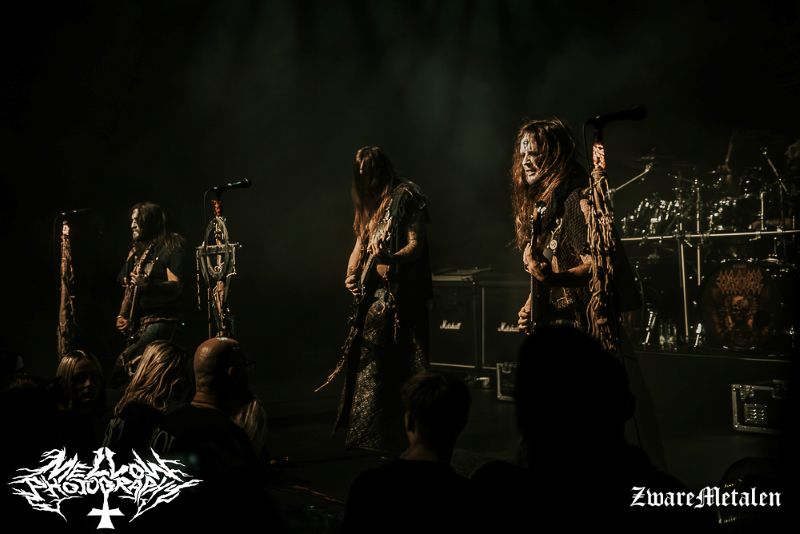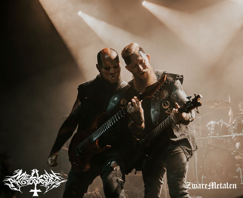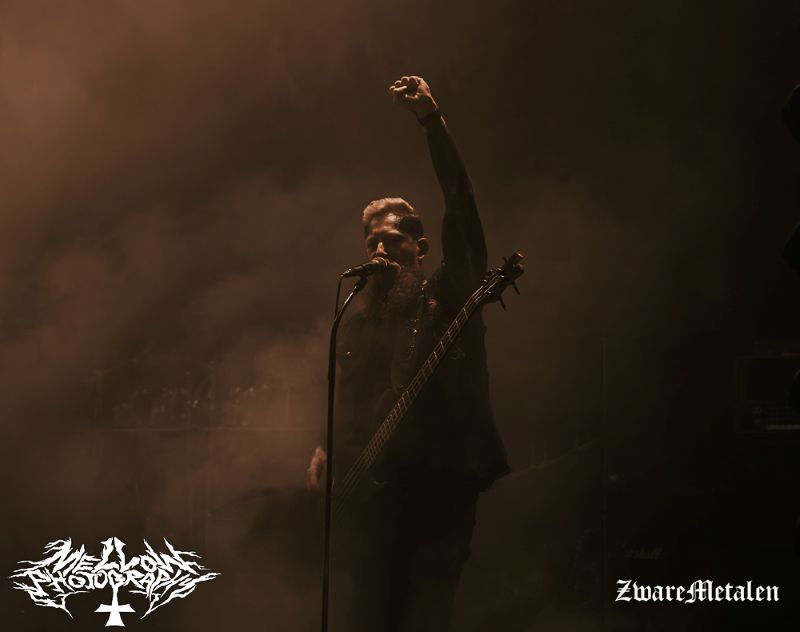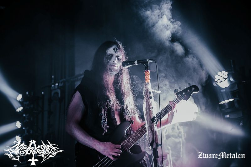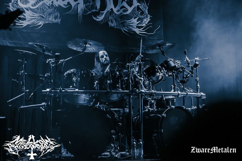 Dan mag het Franse Skaphos zich gaan warm maken voor zijn set van een kleine drie kwartier. Skaphos begint een beetje de standaard tijgerbalsem te worden om de hoofdact Vader op te warmen. Het is al de derde keer dat de band meekomt op tour, na 2021 en 2023. Skaphos werd tijdens de laatste tour gadegeslagen door collega Tafkads en die stak zijn enthousiasme niet onder stoelen of banken. Dit gezien zijn lovende woorden tijdens het concert in Antwerpen in 2023. Ik ken de band van de LP’s Bathyscaphe en Thooï en zodoende weet ik wel wat me staat te wachten. Geheel in het wit geschminkt, met sinistere tekens op het voorhoofd, heb ik het gevoel of de band niet helemaal zeker weet of hij voor de black metal gaat of toch liever death metal blijft spelen. Het is natuurlijk heel normaal dat er heel veel zogenaamde blackened deathmetalbands rondlopen, maar op de een of andere manier hangt de band stevig aan de deathmetalhoek, door bijvoorbeeld duidelijke uitlatingen op de merchstand, dat de band death metal speelt. Nou ja, genoeg prietpraat over wat het dan is, de band is gewoon enorm goed in wat hij doet. Op plaat zeker, maar op het podium is er ook duidelijk sprake van een zeer overtuigende performance.
