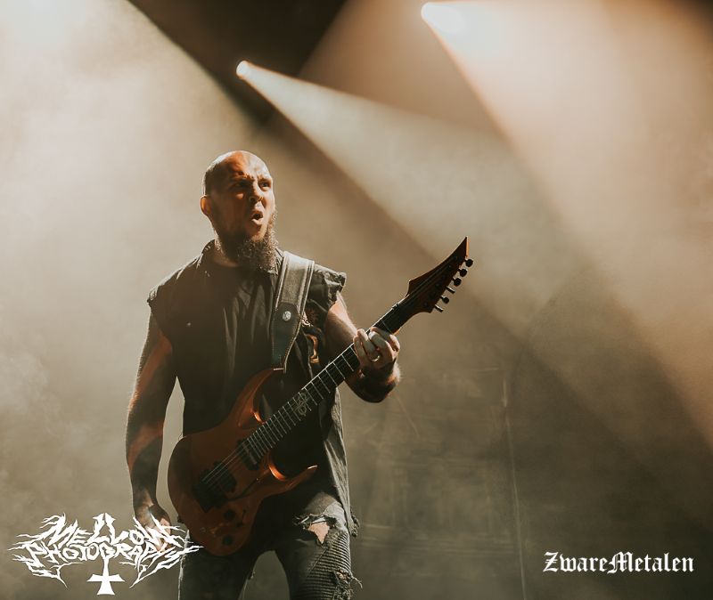 En dan is het moment waar we allemaal op wachten daar. Vader betreedt het podium en de spanning in de zaal is voelbaar. Zonder al te veel poespas beginnen we met This Is the War. Dit knalharde nummer is een goede keuze en is ook tevens het startsein om een moshpit te starten die niet zal stoppen totdat de laatste tonen van dit vlammende optreden uitdoven. Vanzelfsprekend horen we verschillende nummers van de eerdergenoemde jubilerende platen, te weten: What Colour Is Your Blood, Lead Us!!!, Cold Demons, Wings, Xeper, The One Made of Dreams… Ook mag in mijn ogen één van de gaafste live-songs ooit, Carnal, niet ontbreken. Wat knalt dat nummer hard. Uiteraard kunnen we op een dag als vandaag het nummer Helleluyah!!! (God Is Dead) alleen maar hartelijk verwelkomen. Hoe passend. Ook vanavond wordt er naar goede gewoonte een Slayer-nummer tussen geperst en mogen we het doen met Raining Blood. Ik denk daarmee ook de snelste versie die ik ooit heb gehoord!