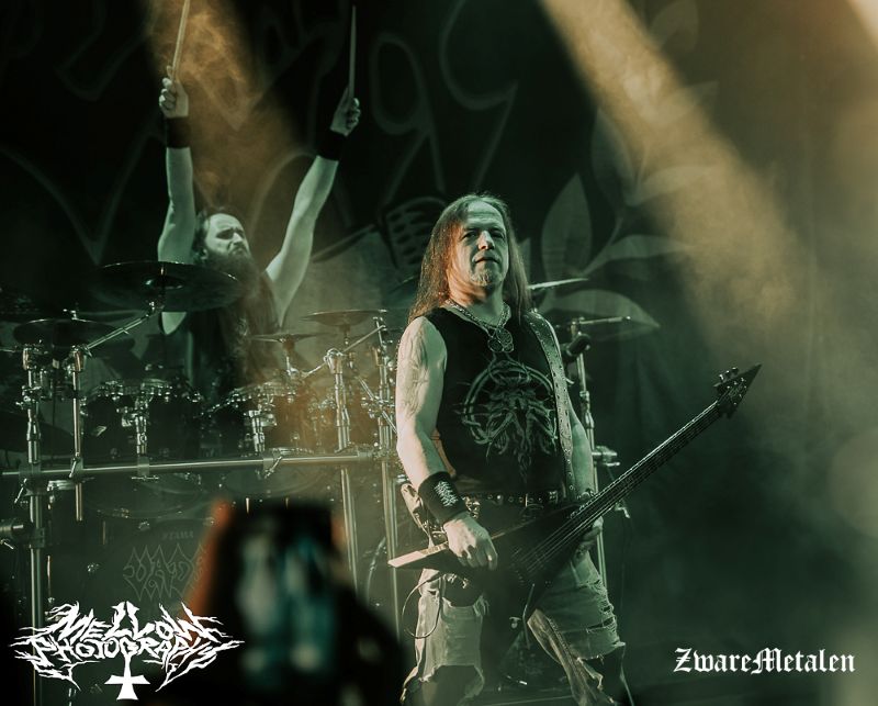 Allereerst mogen de mannen van Rise of Kronos hun opwachting maken. Het gezelschap uit Hamburg treedt op voor een verre van volle zaal. Dat volle gevoel creëren ze vervolgens dan wel op het podium, waar in geen tijd een dikke rook wordt geproduceerd zodat je werkelijk niets van de band ziet. Later, als de rook is opgetrokken, zie je bijvoorbeeld dat er daadwerkelijk een drummer aanwezig is. De band zelf ken ik niet en ik was voor het concert nog even in de war omdat ik dacht dat dit het Franse Kronos was, een band die namelijk ook een wederopstanding meemaakt. Dit Rise of Kronos is echter ontstaan uit de as van de band Surface. En die as hebben ze vervolgens over zich heen gesmeerd, want overal zitten verschillende zwarte vegen op hun lichaam. Wat ook opvalt is de aankleding van het podium. Tekeningen op doek die doen denken aan een Colosseum-achtige set-up, afgewerkt met een enorme backdrop die een duivelse gladiator toont op het historische strijdtoneel dat ten tijde van de Romeinen gewoon was. Dit is ook de afbeelding van hun laatste LP, genaamd Imperium. Helaas onder de radar gebleven bij Zware Metalen.