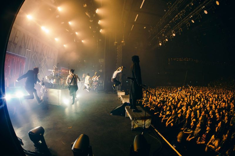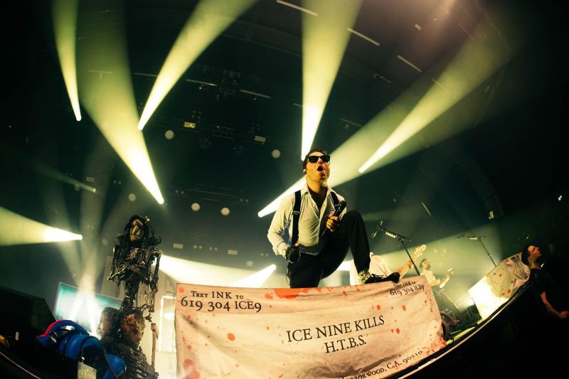 Ice Nine Kills zag ik voor het eerst live in januari 2018 in de Biebob in Vosselaar. Toen was hij nog een gewone band op het rooster. Het album Every Trick In The Book was toen drie jaar oud. In datzelfde jaar, 2018, kwam dan The Silver Scream en schoot de band vervolgens door het metalcorefirmament. Intussen is de band zo groot geworden dat hij niet alleen met alle muzikanten compleet met twee blazers een podium kan vullen maar dat er daarnaast ook grote videoschermen het geheel mogen opvullen. Heel wat attributen, personen en personages passeren doorheen de show de revue. Elk nummer wordt aangekondigd door een gepast videofragment en gedurende de performance die al gauw anderhalf uur duurt, word je meegesleurd doorheen het oeuvre van de band. Je wordt getrakteerd op korte verhaaltjes, er passeren ledematen, een kettingzaag, een dame op stelten, een figurant in een zonnetjespak… Je kan het zo gek niet allemaal bedenken. In ieder geval is het me al snel duidelijk dat de heren zich niet al te serieus nemen.