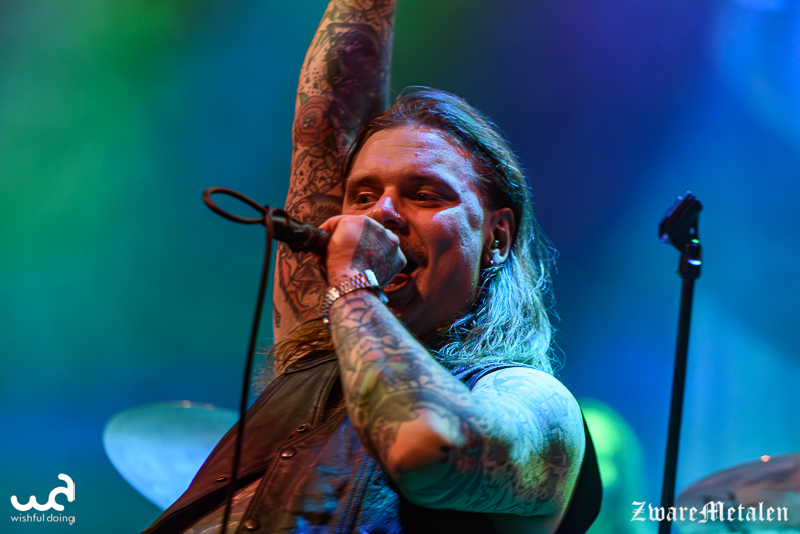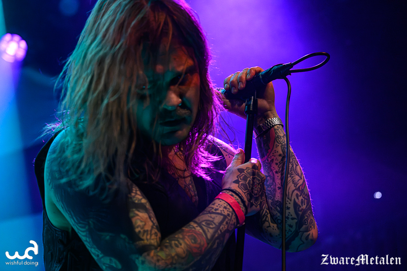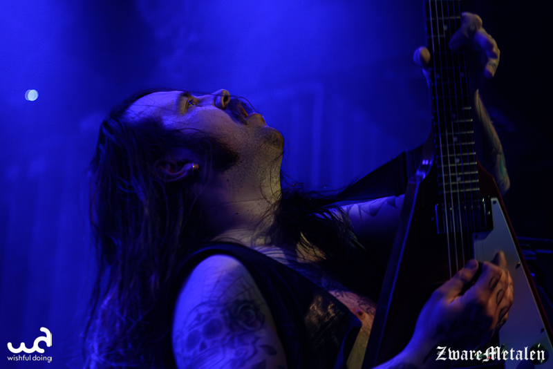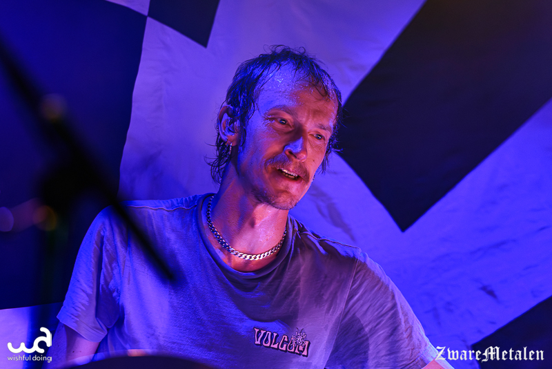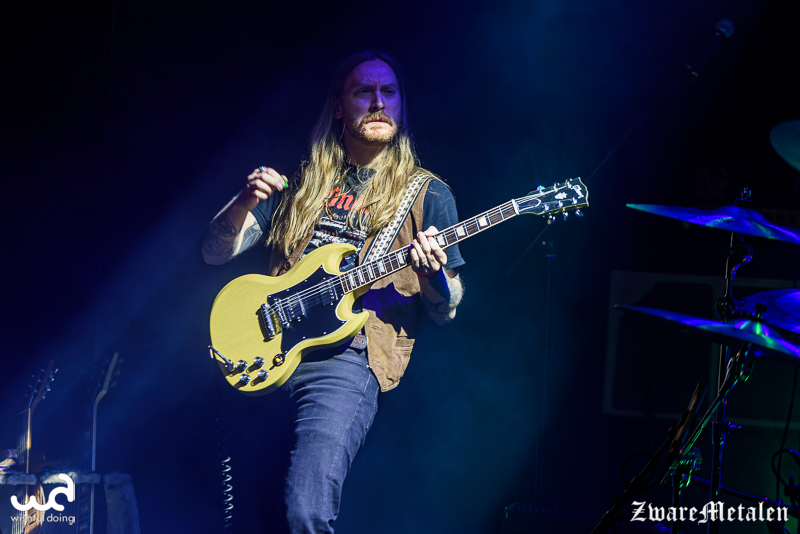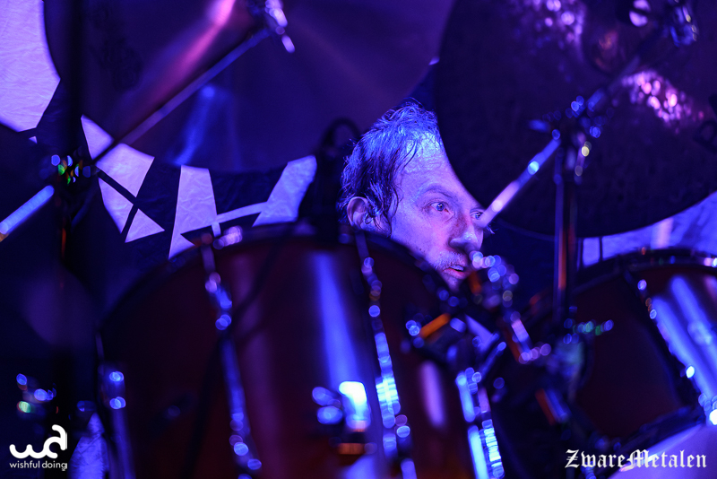 Het voorprogramma mag er dan ook wel wezen. Voor Håndgemeng is het de tweede keer in Nederland en naar eigen zeggen is dit nu al leuker dan die keer in Amsterdam dat ze voor een handjevol mensen speelden. Ik denk overigens wel dat alles de frontman momenteel leuk lijkt, want hij maakt een beschonken indruk. Het flamboyante figuur speelt zich flink in de kijker met een buiktatoeage waar zijn navel dienstdoet als het keelgat van een beer. En dat past ook wel bij hem: van al het gegrom en gebrul valt werkelijk niks te verstaan, maar het enthousiasme is er wel! De mannen spelen uptempo sludge metal die ze zelf ‘doom ‘n’ roll’ noemen. De focus ligt op gitaarriffs en een constante galm van de cymbalen uit het drumstel. Geen wonder dat de bassist dan letterlijk naar de achtergrond verdwijnt. Frontman Martin Wennberg probeert er zelf nog wat extra percussie in te brengen met een tamboerijn, maar lijkt niet bij machte om het ritme te vinden en geeft het al snel weer op.