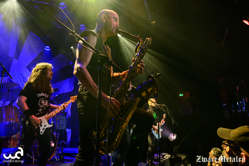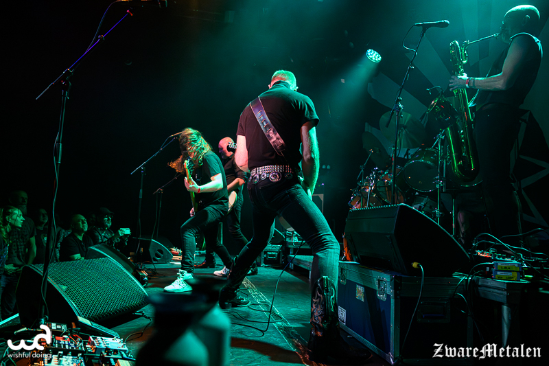 Die hoofdact is natuurlijk Spidergawd. Een graag geziene gast in Groningen en ongetwijfeld overal waar ze komen. Met een achtste studioalbum From Eight To Infinity op zak gaan ze weer op tour en doen als eerste de noordelijke hoofdstad aan en op dag twee Haarlem. De Noren onderscheiden zich met de toevoeging van een baritonsaxofoon die het punkgeluid direct tot een funkgeluid laat klinken. Ook deze mannen zorgen dus voor een vrolijke noot, al gaat de muziek dikwijls over ellende in de wereld. En ook hier is de bassist in eerste instantie naar de tweede linie geschoven, maar met wisselende zangpartijen neemt ook Hallvard Gaardløs soms het middelpunt van het podium in. Zo ook showsteler Rolf Martin Snustad die met zijn saxofoon een stap naar voren doet. Vraag mij niet hoe, maar er wordt gezegd dat hij net tien hechtingen uit zijn mond heeft laten verwijderen. Misschien dat hij daarom twee nummers afwezig is, maar anders zou je er geen vermoeden van hebben.