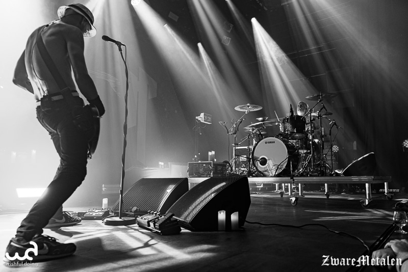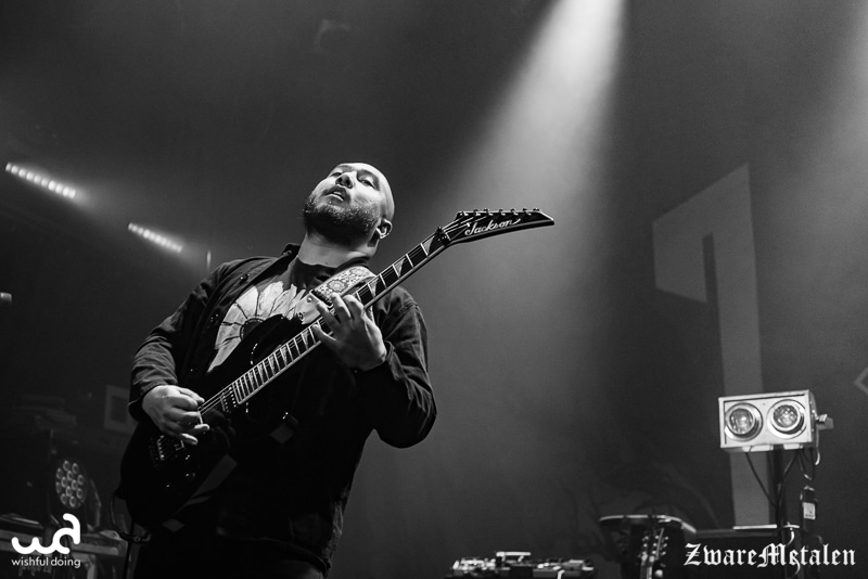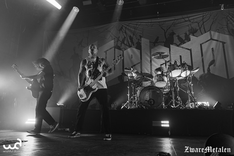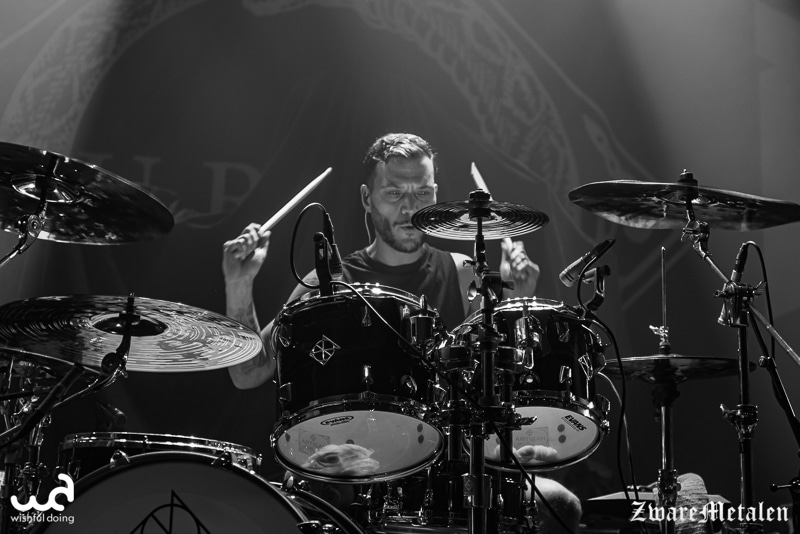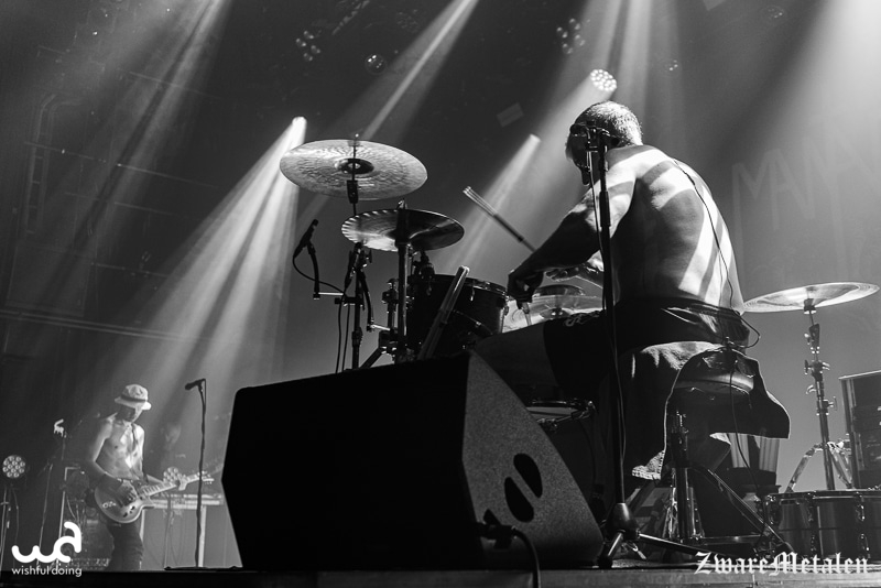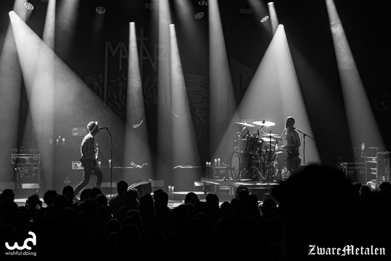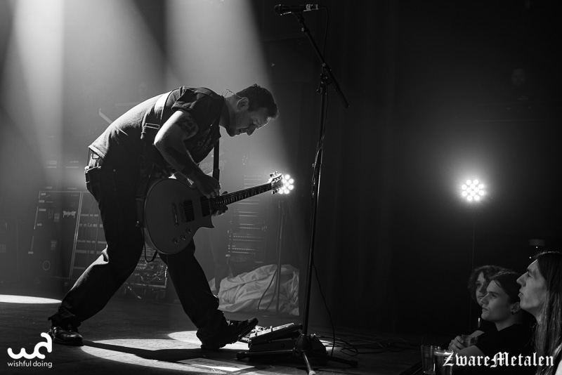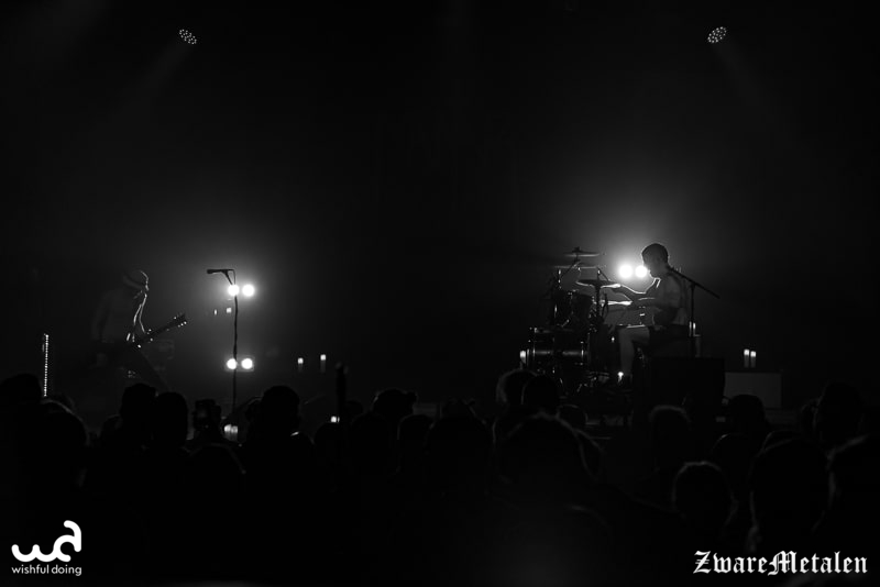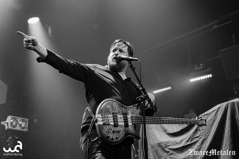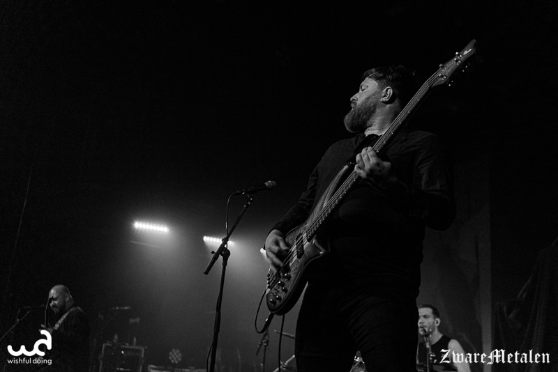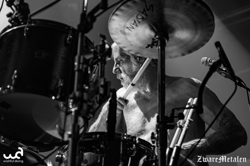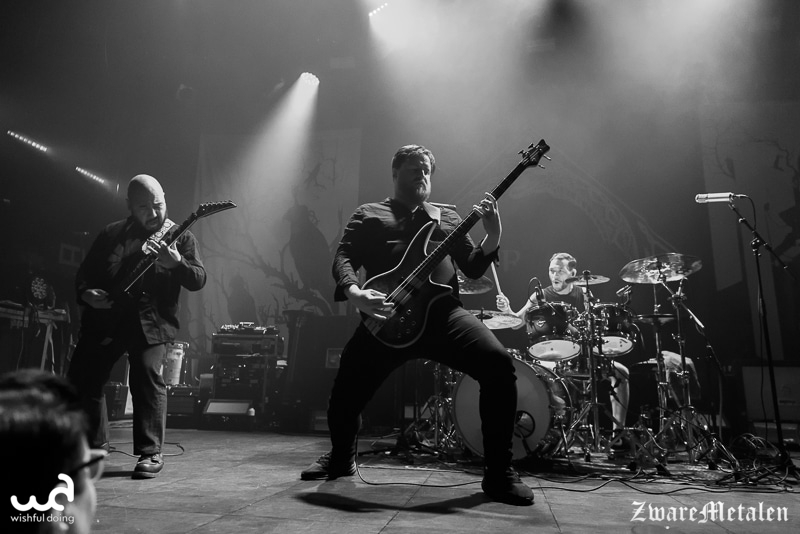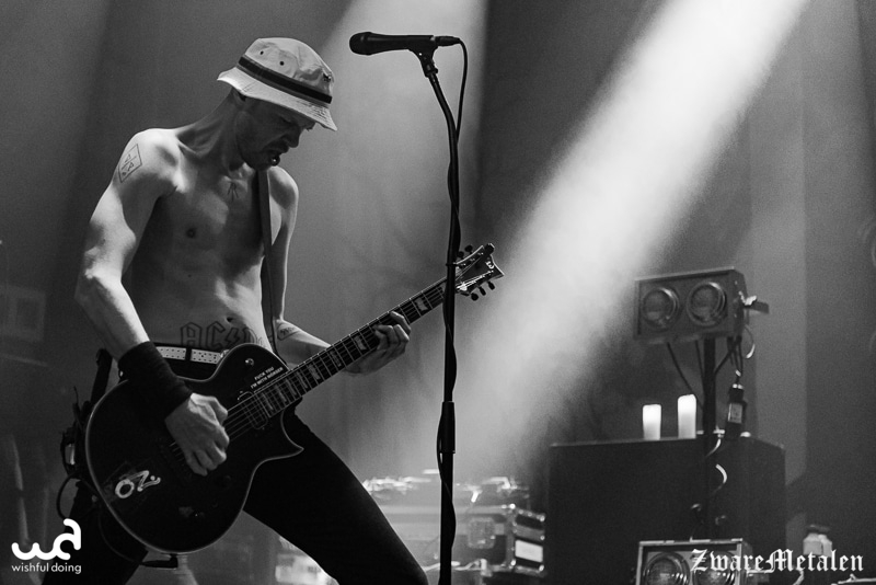 URNE, thuishaven Londen (Verenigd Koninkrijk, ex-Europese Unie), heeft veel sympathisanten binnen onze gelederen. Normaal gesproken zwemt zo’n openingsact de eerste paar nummers tussen de redddingsboeien op dat grote podium en die ongrijpbare leegte richting de mengtafels. Maar vanavond zijn er veel ‘volgelingen’ in huis. Die rode loper ligt er al, als het ware. Een gefikste uitwedstrijd met thuisvoordeel? Hoe dan ook, met ieder akkoord, bij iedere omschakeling helt het Patronaat meer en meer de kant op van dit sympathieke drietal. URNE (sedert 2016), kleurt, hoor ik mezelf denken, binnen de lijntjes. Maar gelukkig lopen die lijntjes wèl uiteen. Een goed gedoseerde mix van decente doom, thrashy riffs en beschaafde blasts-binnen-de-bebouwde-kom, catchy à la Mastodon en toch ook urgent. Die volgelingen heeft URNE niet gekocht, die hebben zij verdiend. En vanavond verdubbeld. URNE nemen we mee als er elders zieltjes moeten worden gewonnen en we niet hoeven letten op een visje meer of minder. Riff: 1; de rest: 0.