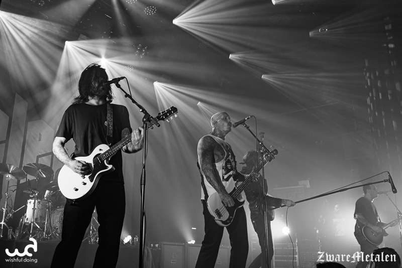 Na de inleidende beschietingen door URNE en de sloopwerkzaamheden à la Mantar is het slotoffensief aan Kvelertak. Vooruitgesneld vanuit Noorwegen, en geenszins onder de radar gebleven, zijn de platenhoezen (briljant), de videoclips (over-de-top) en de black & roll die geen enkele andere band zo quasi-achteloos doch compromisloos feestelijk op de planken zet. Riff-in-het-kwadraat: 3; de niet-aangehaakten: nóg hopelozer op 0. De verwachting dat wij vanavond naar de haaien gaan, wordt reeds zo’n beetje halverwege het eerste nummer bewaarheid. Kvelertak betekent zoiets als wurggreep. Waarvan akte: de vijf Noren laten hun sleepnet los, werpen hun enterhaken uit en… hoofdrol voor de energiek stuiterende en schreeuwende zanger Ivar Nikolaisen… maken maximaal gebruik van de op de locals veroverde microfoonstandaard. Met zonder handschoentjes worden wij hier tot slaaf gemaakt. Van catchy meezingers, allemaal in Kvelertak’s mors taal (maar dat deert niemand), met jaloersmakend memorabele slag- en leadgitaren (takk, Vidar Landa en Maciek Ofstad), onvermoeibaar voortgestuwd door eenvoudig doch dodelijk drum- en baswerk (Håvard Takle Ohr respectievelijk Marvin Nygaard). Onderhandelen, staakt-het-vuren? Waarom zou je, als je lekker ‘in je kracht staat’. Tijdens de enige, korte, ‘lulpauze’ adresseert zanger Nikolaisen geruchten over het uit elkaar gaan van de band: ‘Wij stoppen pas met spelen als heel Nederland onder de zeespiegel is verdwenen.’ Fans, maar de ook vele instant bekeerlingen, vinden het allemaal ‘great’. Eveneens tijdgeestconform worden in het afsluitende ‘Bråtebrann’ fake en echt met elkaar verzoend: op de welbekende kreet ‘Air guitar, come on!’, volgt een levensechte, bevlogen gitaarsolo en gaan alle trossen nog één keer los. Kvelertak komt ermee weg. Glansrijk.