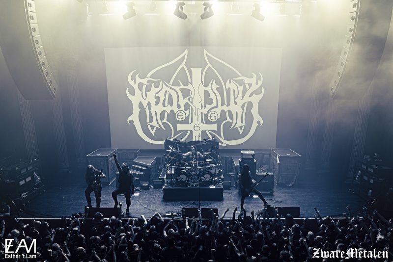 Net als Immolation bestaat Marduk ook al een hele tijd. Zesendertig jaar om precies te zijn. Dan mag je wel verwachten dat de mannen weten hoe je een show neerzet. Dat gebeurt vanavond ook. Wat heet. Het begint al bij de opkomst; de vier mannen komen zelfverzekerd het podium op, met als grote aanvoerder Mortuus die eerst even over het podium paradeert en daarbij het publiek eens indringend aankijkt. Het voelt alsof er een commitment van het publiek wordt verwacht. Die is er ook , gezien de vele vuisten in de lucht tijdens opener Frontschwein en helemaal bij het daaropvolgende Wolves, dat gelijk een van de hoogtepunten is door die zeurende melodielijn die maar doorgaat. Live wordt dit vanavond ondersteund door lichten die alle kanten op schijnen en flikkeren, alsof Marduk een soort waanzin probeert te vangen in een show. Dat lukt vanavond ook wel, want de fucking tering: Marduk speelt hier een furieuze set, waarbij gas terugnemen geen moment aan de orde is. Wat een intensiteit wordt hier geëtaleerd. Het is overdonderend, ook qua geluid, dat steeds harder gaat staan, met name het basgeluid wordt flink opgeschroefd en bij het einde van Throne of Rats helemaal opvalt, met name in die dreun en de knalharde schreeuw.