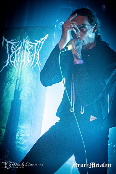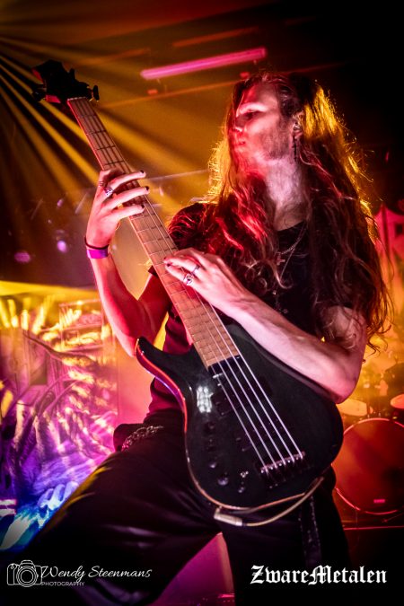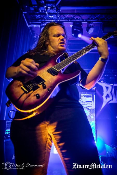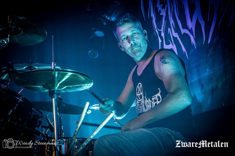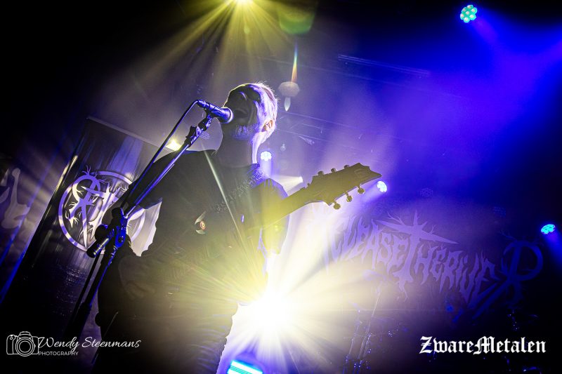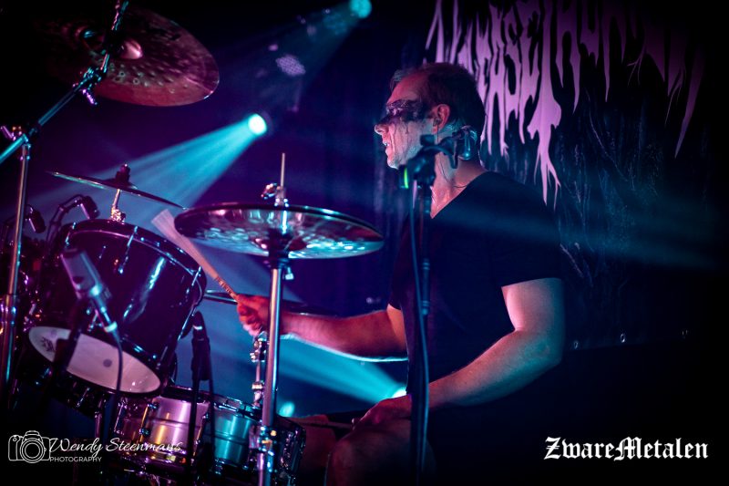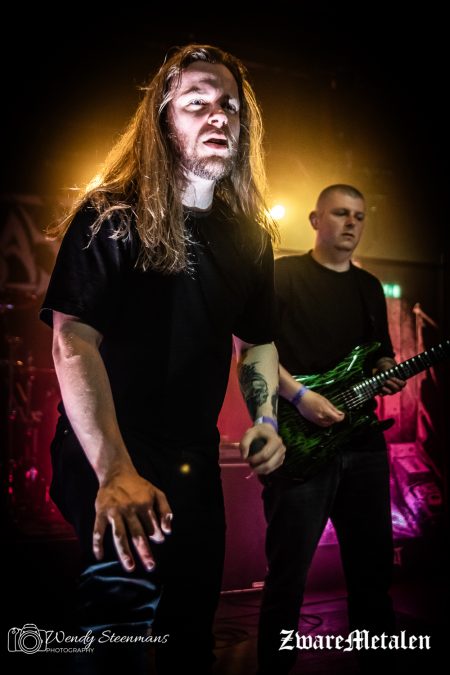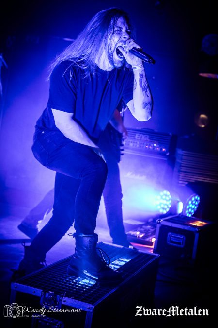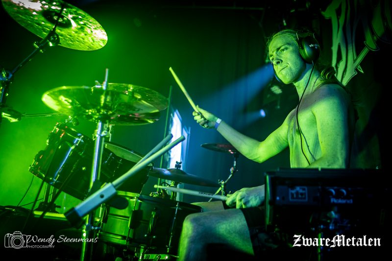 Aan de zwarte strepen van niet al te hoge kwaliteit over de ogen en de grimas is goed te zien wie de hardste werker in de band is. Het duurt namelijk niet lang of de donkere veeg druipt over het gezicht van drummer Mark Bos. Iets wat nog maar eens bevestigt wordt bij het nummer Lethean Sorrow door frontman Zeno de Jong. Die noemt het namelijk de ‘kill your drummer’ track van de vorig jaar uitgekomen plaat Virtues of the Vile. Het is niet moeilijk te zien waarom, bijna vijf minuten aan stevige blastbeats en ellenlange bell rides vragen duidelijk het uiterste van de slagman en dan doet hij ook nog eens backing vocals. Petje af voor deze muzikant. En hetzelfde geldt voor de rest van de band, want het publiek laat al wat meer beweging zien. Al is het uitkijken waar je je ledematen naartoe gooit, want de strobe- en zwaailichten zijn precies op ooghoogte van het publiek ingesteld, dus voor de koppijn hoef je niet op een zwaaiende vuist of de volgende ochtend te wachten.