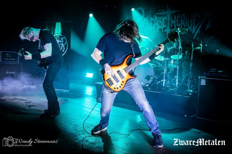 Release the River mag het niveau nog wat verder omhoog brengen. De blackened deathmetalband uit Leiden hangt bij nader inzien toch maar de grote banner boven het podium. Ze mogen zichzelf ook best profileren, als nestor van de avond. Twee derde van de band gaat namelijk al twaalf jaar mee, destijds onder de naam Illusionless. En ook uit die oude doos wordt vanavond een nummer gepeeld.