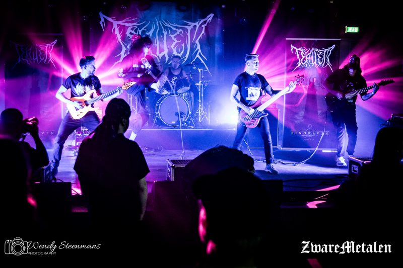 Opener van de avond is het Twentse Tenuem. De blackened metalcoregroep deed in februari nog mee met de Metal Battle en wist ook daar te imponeren. Voordat de band hier zijn kunstje kan vertonen, moeten we echter eerst een theaterstuk van gastheer Niels aanhoren dat net iets te lang – en zonder al te veel resultaat – het publiek probeert op te zwepen. Dat kunnen we beter overlaten aan de boomlange frontman van Tenuem zelf die zichtbaar staat te popelen om te beginnen. In slopend tempo razen de Twentenaren door hun vorig jaar uitgekomen debuut EP Singraven en wie goed oplet kan nog twee extra nummers horen. Keiharde blastbeats scheuren door de zaal heen en zetten de boel direct op scherp. Energieniveaus stijgen gestaag en de eerste bewegingen voor het podium vinden al plaats. Een geslaagd begin van de avond door een band die nog veel te bieden heeft.