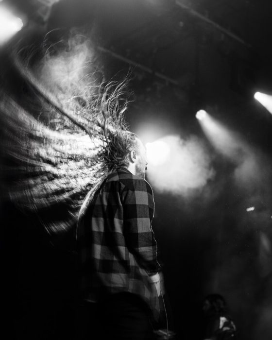 Door naar House of Protection. Een tweetal met een verleden in Fever 333, dat op papier een mix speelt van hardcore, drum ‘n bass en punk. Dat wil ik wel even zien. En te zien valt er genoeg, want de band gebruikt het visuals scherm optimaal. Vette flitsende beelden worden begeleid door een opfokte cocktail van hardcore, hiphop en beats. Dat alles wordt ook met volle energie gebracht, en dat terwijl dit de laatste dag van de tour is. Zo duikt zanger/gitarist Stephen bij het derde nummer het publiek al in en mept Drummer Aric (die in een Brutus-opstelling richting het publiek zit) zijn halve drumstel aan gort.