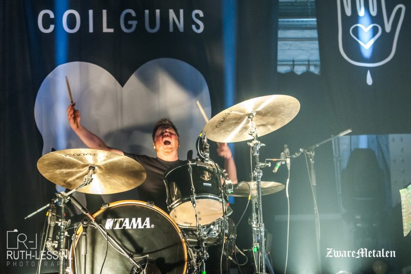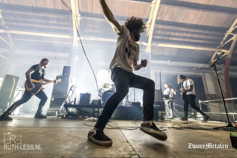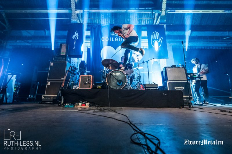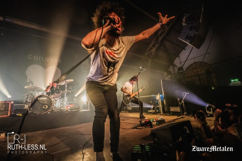 Even een korte tussenstop in de skatehal alwaar de Amsterdamse psychedelische rockers Temple Fang een secret show doen. Altijd lekker, altijd goed live, maar de overbelichte skatehal, matige akoestiek en het moeilijke zicht op de band, maakt de genietbaarheid er voor mij niet beter op. Na een half uurtje begeef ik me dan ook maar naar de Engine Room waar ik nog een staartje meepik van het live altijd overtuigende Zwitserse noiserock/-punk collectief Coilguns. Hun half jaar oude album Odd Love wordt integraal vertolkt en ik loop de zaal in als Featherweight wordt ingezet. Een veelzijdige song met een rustige opbouw, een catchy refrein, maar ook met een blastbeat en uiteindelijk een botte sludgeriff. Meest in het oog springende van deze band is uiteraard frontman Louis Jucker. Hoewel zijn zang niet altijd even zuiver is, compenseert hij dat live met een enorm energieke uitstraling. Vooral als hij de gitaar even aan de kant legt (mag ie vaker doen) stuitert hij over het podium en begeeft hij zich regelmatig in het publiek om deze adrenaline over te brengen. En dat lukt, de mensen in de zaal hebben het overduidelijk goed naar hun zin. En het levert (dankzij onze Ruth) ook nog prachtige plaatjes op! (RL)