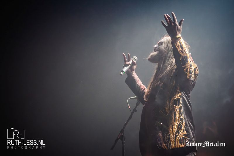 Ja! Hier heb ik toch wel behoorlijke tijd op zitten wachten en velen met mij. Ik had eigenlijk tijdens de voorgaande editie al verwacht, maar ik denk dat Vicotnik en co. even wat meer tijd nodig hadden om het complexe werkstuk Black Medium Current op een waardige manier voor te bereiden voor een grootse liveshow. Want dat verdient deze schitterende plaat van Dødheimsgard als geen ander. En uitpakken, dat doen ze. Negen man sterk betreden ze het podium, waaronder een achtergrondzanger- en zangeres, twee mannen in hoodies die zorgen voor de keys en samples. Maar meest in het oog springende figuur en bandbrein is uiteraard Yusaf ‘Vicotnik‘ Parvez. Met glitterjas, sluier, rood-witte gezichtspaint en een zak vol met stof (waar hij af en toe wat van de lucht in gooit) maakt hij op het eerste gezicht een ietwat clowneske indruk, maar als je bedenkt wat voor genie er achter deze vermomming schuil gaat dan neem je het al snel bloedserieus.