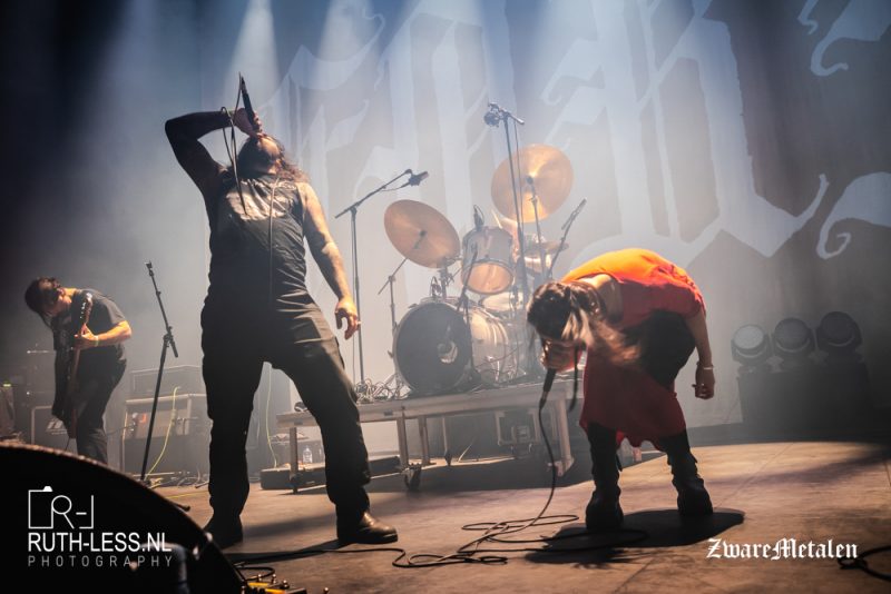 Een hoop bombarie, een bebaarde redneck die lomp staat te schreeuwen, een vrouw die geknield op het podium zit en een muur van chaotische geluiden: Forn is net begonnen aan zijn set. De band uit Boston maakt een mix van sludge en funeral doom, maar wie bij dat laatste denkt aan tergend trage tempo’s heeft het mis. Dit vijftal trapt het gaspedaal regelmatig stevig in, terwijl je het gevoel hebt dat je hoofd daaronder ligt. Het is zó lomp, zó overweldigend, dat het haast fysiek voelt.