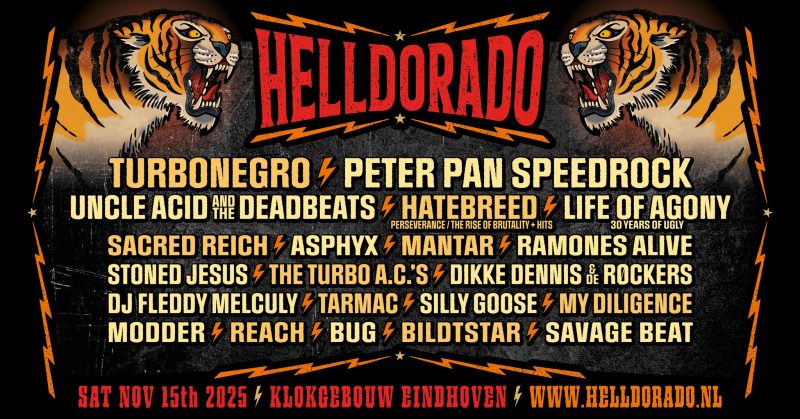 Hoe beter de druilerige zaterdag te besteden dan onder het dak van het Eindhovense klokgebouw? Zeker als daar de zesde editie van het Helldorado festival gehouden wordt! Met onder andere Hatebreed, Turbonegro en Sacred Reich op het programma is de lichtstad een waardige bestemming. Redacteur Ruben en fotograaf Tessa Verstraete voegden zich tussen de toegestroomde turbojugend en verzorgden het verslag voor Zware Metalen.
