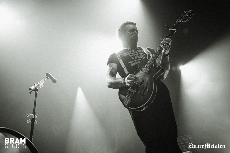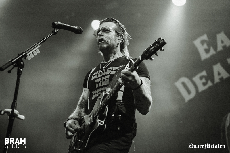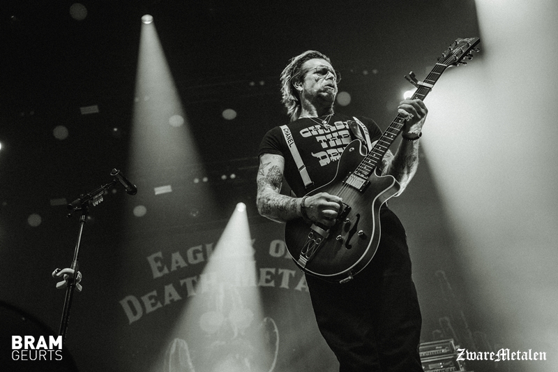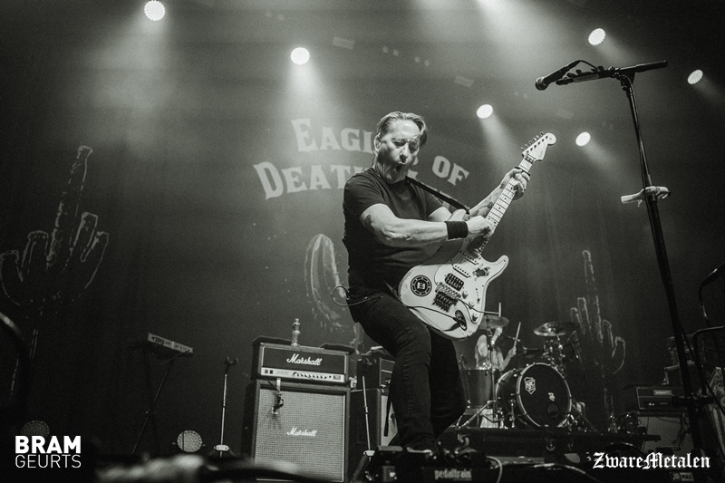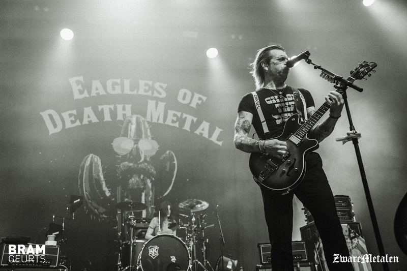 Eagles of Death Metal is zo’n band waarvan geregeld vergeten wordt dat ze ondertussen al zo lang bestaan. Jesse Hughes en Josh Homme hebben de band vorig millennium opgericht en ondertussen veel meegemaakt. Hierdoor zullen er weinig mensen zijn die nog nooit van de band uit het Californische Palm Desert hebben gehoord, of ze allemaal drie nummers op kunnen noemen betwijfel ik dan weer. Na 16 jaar is de band eindelijk weer terug in Tilburg. Niet met nieuwe muziek, want het laatste album komt uit 2015, maar wel met een energieke setlist vol fijne en dansbare nummers. Het Tilburgse The New Hip staat na bijna 20 jaar radiostilte weer op het podium om de avond warm te draaien. Fotograaf Bram Geurts was aanwezig voor een verslag.