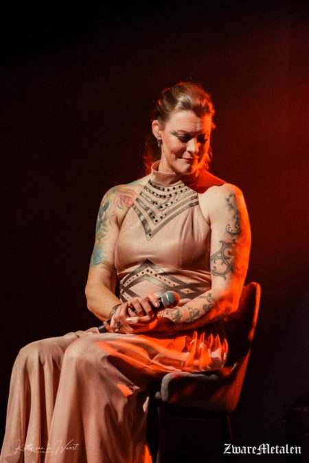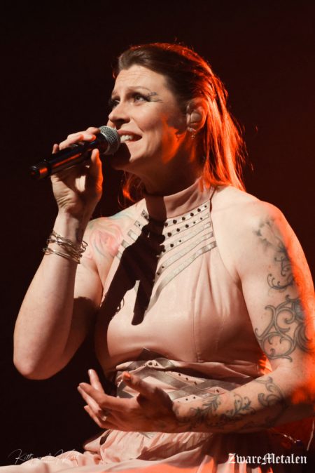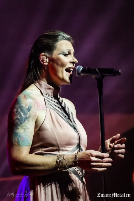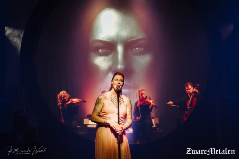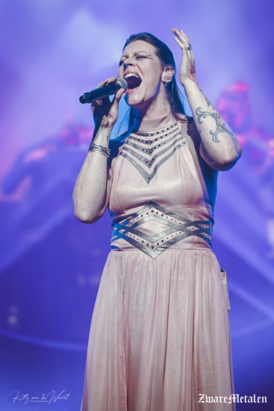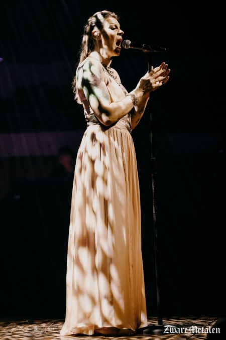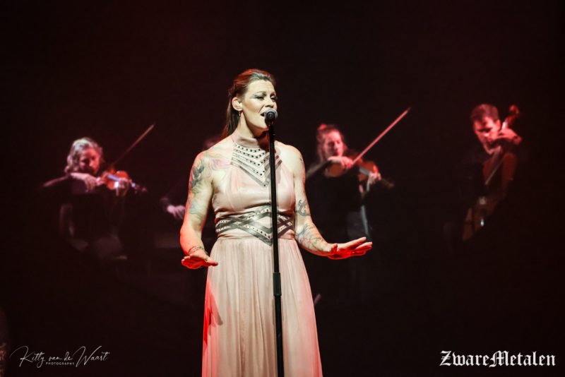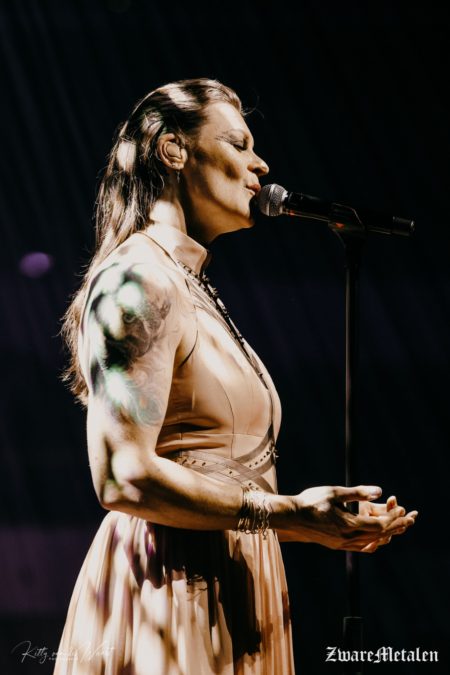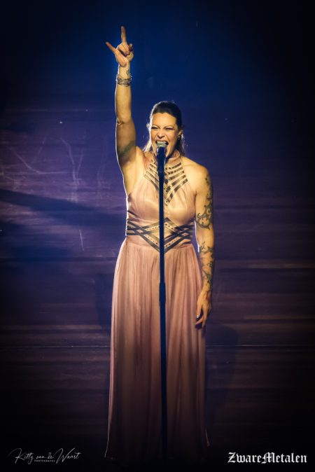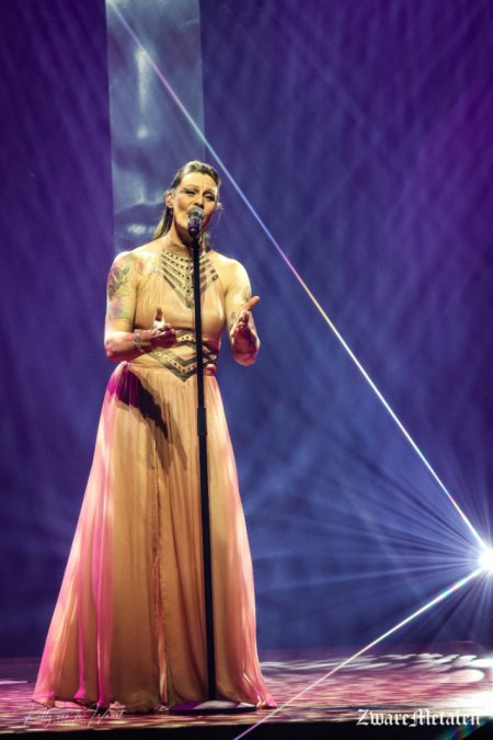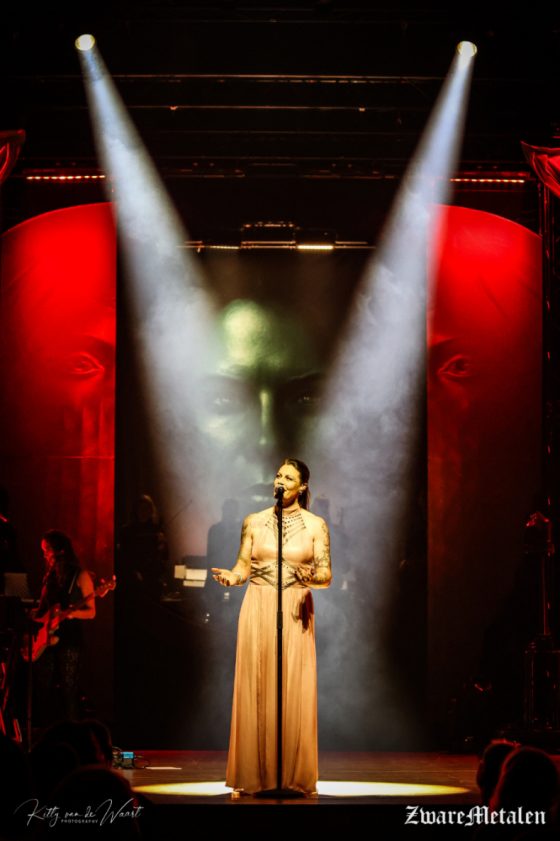 Als een soort Griekse godin verschijnt Floor Jansen op het podium van TivoliVredenburg in Utrecht. Geen zwart leder, geen studs maar wel een zachtroze jurk die perfect past bij de doeken die als zuilen het decor vormen voor deze avond. En dat is geen toevallige keuze als je de titel van haar eerste en meteen uitverkochte theatertour hoort: Strijdlust. Floor vertelt over haar jeugd, over meevallers en tegenslagen en hoe het leven van haar een strijder heeft gemaakt. De grote zaal luistert ademloos en de heel persoonlijke nummers komen flink binnen. Maar Floor’s blote voeten verraden meteen dat er ook ruimte is voor wat luchtigheid. En de jurk is wel roze, maar toch ook leder en een streepje metal is daarom nooit ver weg. Kitty van de Waart was erbij en mocht de avond vastleggen.