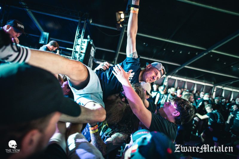 Als we ons na Downfall Of Gaia weer richting Brammert Stage begeven heeft grijs inmiddels plaatsgemaakt voor bewolkt blauw. Vanaf de eerste noot van All Out War is er een moshpit. Het hardcore minnende publiek wordt op zijn wenken bediend met vette grooves en pompende ritmes. Zelf ben ik eigenlijk niet eens zo van de hardcore, maar All Out War klinkt als een klok. De energieke band weet het publiek stevig bij de kladden te grijpen met knappe tempowisseling en toffe vertragingen. Sommige loopjes hebben wel iets weg van Bolt Thrower maar vooral heel veel van Slayer. De tent staat tjokvol. Dankzij de centrale situering van het sanitair en korte rijen bij de bar hoef ik nauwelijks iets van de show te missen en kan ik weer vooruit met volle beker en lege blaas. All Out War schuwt ook de hogere tempo’s niet en de eerste tien meter voor het podium ontstaat een soort pit. Op het geluid valt deze editie wederom niets af te dingen. Drummer Jesse is lekker lomp aan het houthakken en de zanger roept het publiek op om te stagediven. Daar is helemaal geen stagedivepodium voor nodig want de eerste duikers zijn een feit. Zanger Mike geeft alles, gezien zijn pet die hij af en toe leeg giet. Ik moet het laatste stukje van All Out War helaas missen om weer tijdig aan te treden bij Carnivore A.D. maar ik kan het publiek in veilige handen (of vuisten) achterlaten bij de mannen van All Out War. (JS)