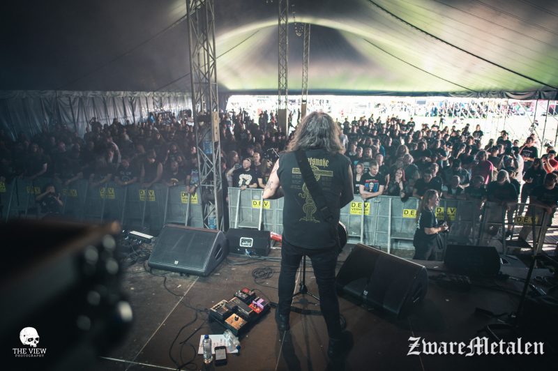 We zijn alweer meer dan zeven uur non-stop bands aan het kijken als het de beurt is aan de oudgedienden van Benediction. Hun oldschoolgeluid is direct herkenbaar. Voor nieuwkomers is de muziek misschien nog spannend ,maar ik vind het soms wat voorspelbaar. Het spelplezier van de mannen uit Birmingham druipt er wel vanaf. Het optreden wordt na een paar nummers stilgelegd. Zanger Dave doet een huwelijksaanzoek aan zijn vriendin Heidi (die ‘ja’ zegt). Hij brengt een toast uit en kondigt wat oud materiaal aan (waaraan hij grappend toevoegt ‘net als ik’) en we gaan met Transcend The Rubicon terug naar het begin van de jaren negentig. Heidi mag weer plaatsmaken want de deathmetalstoet moet door. Het klinkt allemaal te gek maar boeit het me genoeg? Beetje bij beetje slepen ze me toch het deathmetalmoeras in. Wat een strot heeft die gast! Na bijna acht uur non-stop bands kijken biedt de helling weer soelaas voor deze oude van dagen. Het blijkt ook lekker om de boel even van een afstandje binnen te laten komen. De laatste wolken druipen inmiddels ook af. Benediction blijkt nog steeds een band die er keihard voor knokt en een behoorlijke schare fans uit hun dak laat gaan. De nummers van het spiksplinternieuwe album Ravage Of Empires knallen heel lekker. Benediction is geen straf! (JS)