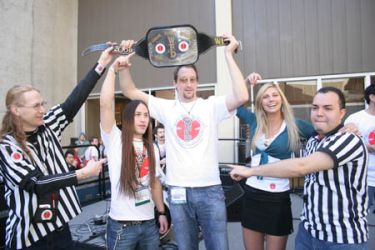 De winnaar in de categorie ‘fastest hands’ (rechts naast Tim op de foto hieronder) kwam tot 1007 beats in één minuut.