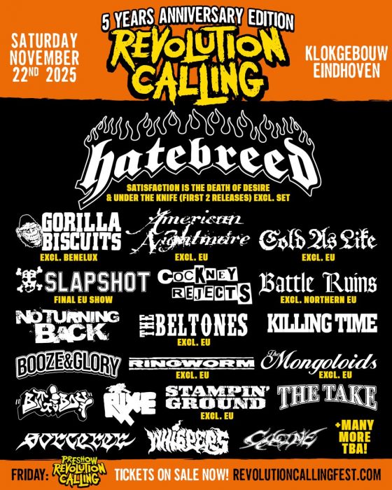Een week later, op 22 november, doen de heren het kunstje nog eens vrolijk over, maar dan op Revolution Calling. De nadruk tijdens die set ligt weliswaar op het debuut Under The Knife en de klassieker Satisfaction Is The Death Of Desire. Hatebreed staat als headliner geboekt voor deze editie en staat naast bands zoals Gorilla Biscuits, Slapshot, American Nightmare en Killing Time. Kaarten gaan hard maar zijn nog te koop via de site voor het bedrag van €72,50. Zoals de organisatie van het festival zelf al eerder schreef: don’t sleep on it!