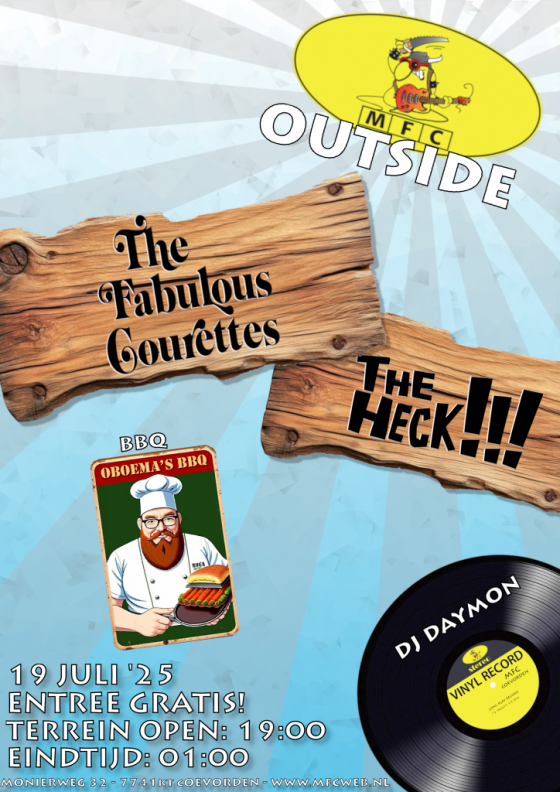 Het is zomer dus kunnen we lekker naar buiten in Coevorden. Bij MFC Outside 2025 op 19 juli is het genieten van een barbecue met een zomers speciaalbiertje en twee fijne bands: The Courettes is een explosief garagerock duo uit Denemarken en Brazilië. En van dichter bij huis (Klazienaveen  om precies te zijn) komt The Heck met hun garagerock sixties pophits die staan als een hunebed. Als de bands stil zijn vult DJ Daemon de leegtes op met klassiekers vanaf vinyl.