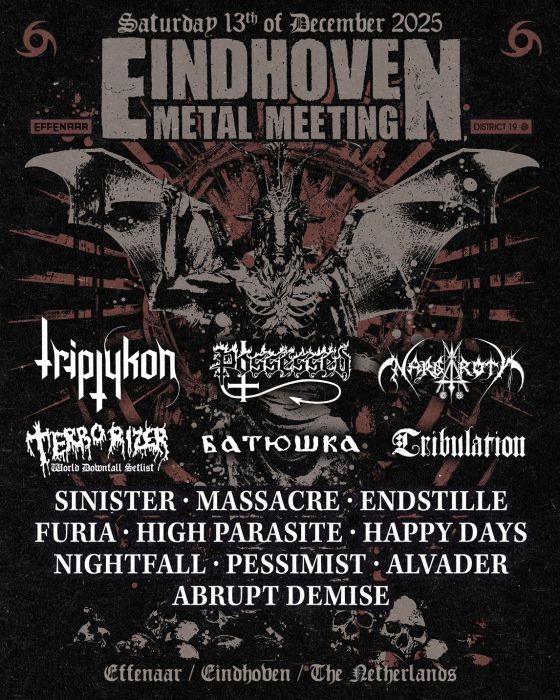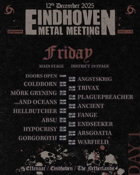 Zaterdag zijn de zeventig minuten toebedeelt aan het speciaal overkomende Triptykon, dat ook enkele Celtic Frost-klassiekers op de setlist heeft. Nagaroth, Tribulation, Furia en Happy Days komen eveneens voor ‘EMM’ naar Eindhoven en op deze dag speelt Sinister een speciale old-schoolset.