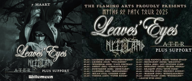 De Duitse symfonische female fronted band Leaves' Eyes, het Syberische folkduo Nytt Land en de Chileense blackened deathmetalband ATER hebben de handen ineen geslagen en zijn volgende maand samen op toer door Europa. Op 7 maart stopt de karavaan in Nederland, in het Arnhemse Willemeen.Lees verder ›