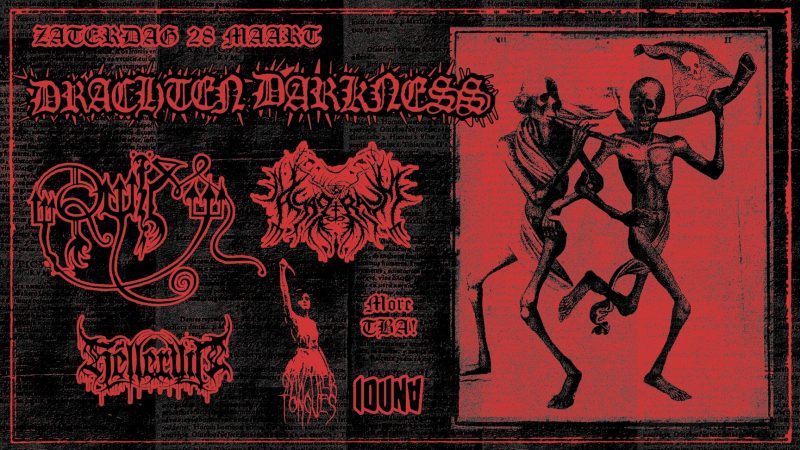 28 maart: de eerste editie van Drachten Darkness in Iduna. Een festival dat zich richt op de atmosferische en donkere kant van extreme metal. Geen vrachtwagenlading aan bands, maar exclusieve sets van zorgvuldig geselecteerde acts. Koude riffs, naargeestige sfeer, blastbeats en sonische terreur gegarandeerd. De eerste keer present: Ruïm, Asagraum, Hellruin, Gnaw Their Tongues, Grafjammer en Deathless Void. Zware Metalen geeft kaartjes weg.