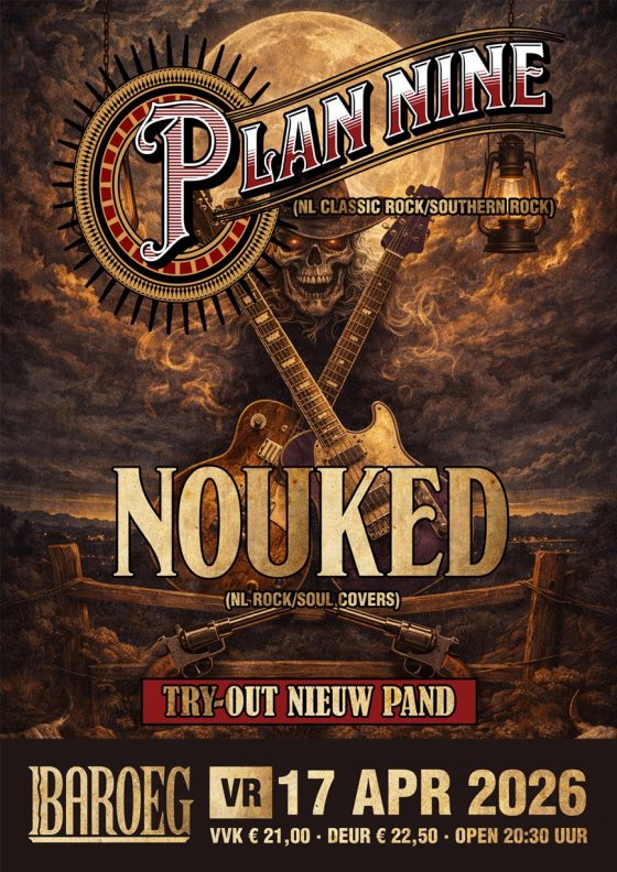 Baroeg is het nieuwe pand in Rotterdam nog aan het uitproberen en doet dat 17 april met onvervalste hardrock. Plan Nine komt langs met muziek die qua stijl meandert van Whitesnake naar Van Halen en de strot van Robert Soeterboek als extra wapen. Nouked sluit ook aan: de band eert legendarische artiesten als Led Zeppelin, AC/DC, Janis Joplin en Tina Turner met krachtige en soulvolle uitvoeringen. Zware Metalen geeft kaartjes weg!